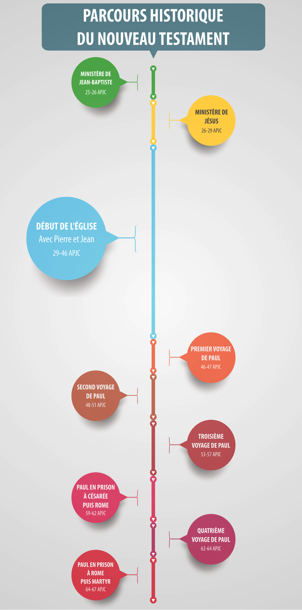 Si vous voulez connaître les principales périodes du Nouveau Testament ainsi que leurs dates, cette frise est faite pour vous. Oui, elle est basique… mais elle sera très prochainement suivie de sa grande sœur qui contiendra beaucoup, mais alors beaucoup plus d’informations.