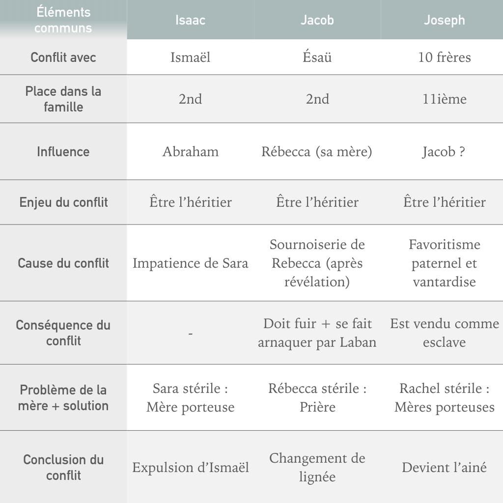 Tous ces « non-aînés » ne sont pas des usurpateurs car on sait très tôt dans chacun des récits que Dieu les a choisis. Il est intéressant de constater que celui qui a vécu les moments les plus intenses avec Dieu (Jacob pour ceux qui n’auraient pas compris) est celui qui avait le plus de problèmes moraux (hérités d’une famille très dysfonctionnelles). A contrario, celui qui est le plus droit (Joseph) n’a reçu aucune révélation spéciale de Dieu : est-ce parce que son père l’a (très bien) élevé après ses diverses rencontres déterminantes avec Dieu ?