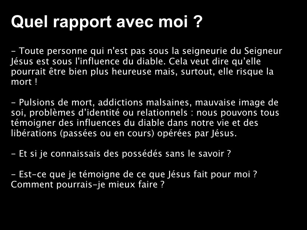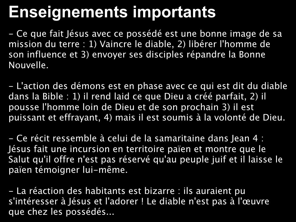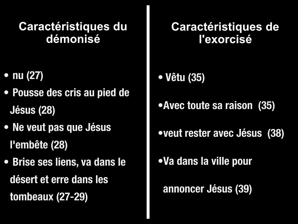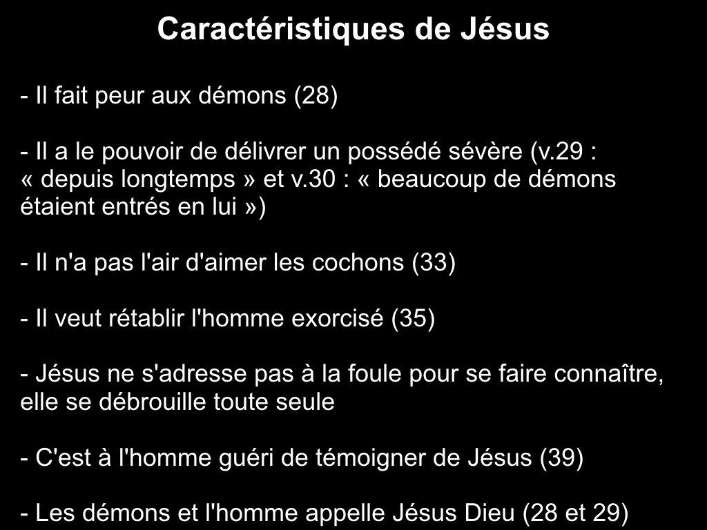 Luc 8.26 Ils abordèrent dans le pays des Géraséniens, qui est en face de la Galilée. 27 Lorsqu’il fut descendu à terre, un homme de la ville, qui avait des démons, vint au-devant de lui. Depuis longtemps il ne portait pas de vêtement et il ne demeurait pas dans une maison, mais dans les tombeaux. 28 Voyant Jésus, il poussa un cri, tomba à ses pieds et dit d’une voix forte : Pourquoi te mêles-tu de mes affaires, Jésus, Fils du Dieu Très-Haut ? Je t’en prie, ne me tourmente pas ! 29 Car Jésus enjoignait à l’esprit impur de sortir de l’homme, dont il s’était emparé depuis longtemps ; on le gardait lié de chaînes, et les fers aux pieds, mais il brisait ses liens et était poussé par le démon dans les déserts. 30 Jésus lui demanda : Quel est ton nom ? – Légion, répondit-il. Car beaucoup de démons étaient entrés en lui. 31 Et ils le suppliaient de ne pas leur ordonner de s’en aller dans l’abîme. 32 Il y avait là un important troupeau de cochons en train de paître sur la montagne. Les démons le supplièrent de leur permettre d’entrer en eux. Il le leur permit. 33 Les démons sortirent de l’homme, entrèrent dans les cochons, et le troupeau se précipita dans le lac du haut de l’escarpement et se noya.
