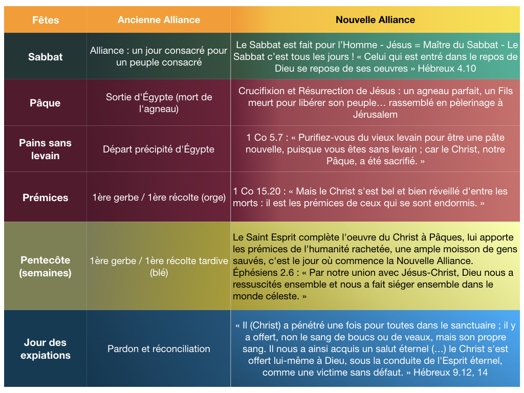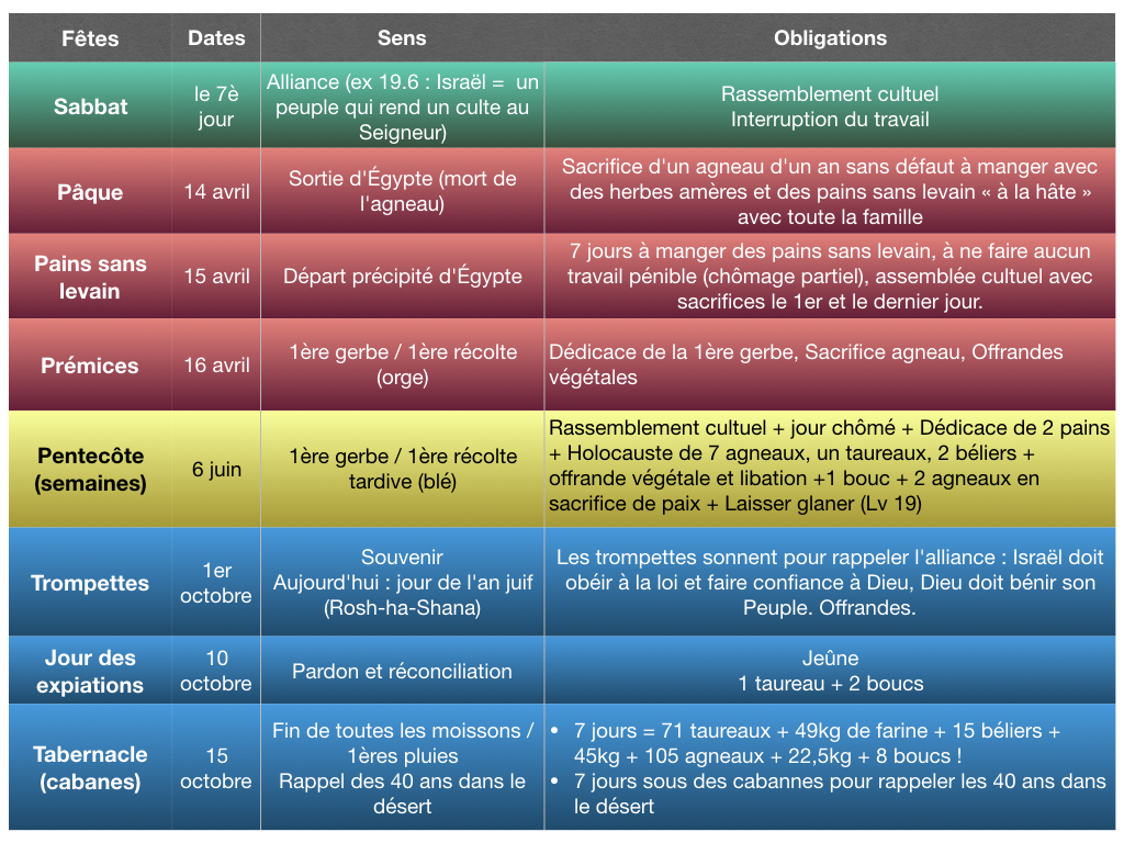 La vie des hébreux était rythmée par un calendrier et nous trouvons dans Lévitique 23 les principales fêtes (=temps de repos) annuelles auxquelles ils étaient conviés. Voici un tableau qui donnera une vue d’ensemble de celles-ci (avec quelques précisions tirées d’autres passages de la Loi de Moïse) :