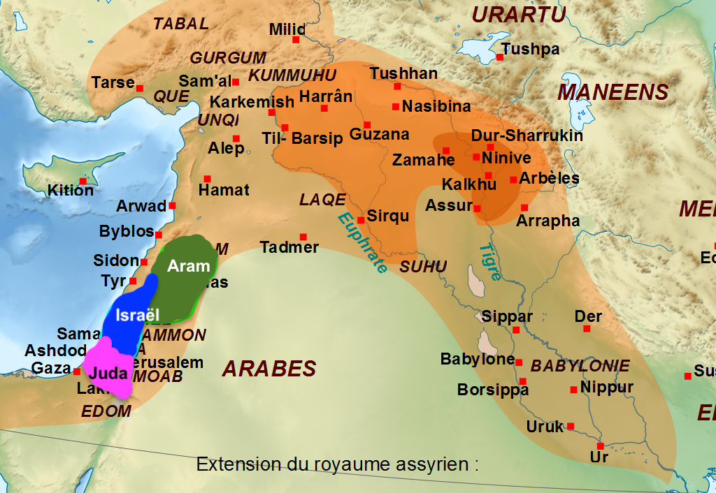 L’union fait la force, c’est bien connu ! Voilà la bonne idée d’Israël (en bleu) et d’Aram-Syrie (en vert) qui aimeraient que Juda (en rose) les rejoigne afin de former une bonne coalition qui résisterait peut-être aux puissants assyriens :