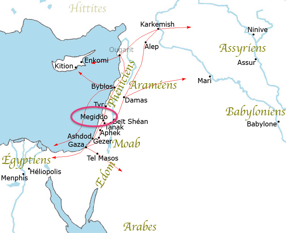 Rappelez-vous de la situation d’Israël en Canaan : prise en étau entre un géant au sud qui est l’Égypte (en jaune) et les géants venant du nord que sont l’Assyrie (en violet) et Babylone (en vert). Tous veulent imposer leur suzeraineté à tous les royaumes alentours, ici nous voyons que l’Égypte a eu l’habitude de contrôler ce précieux couloir routier.