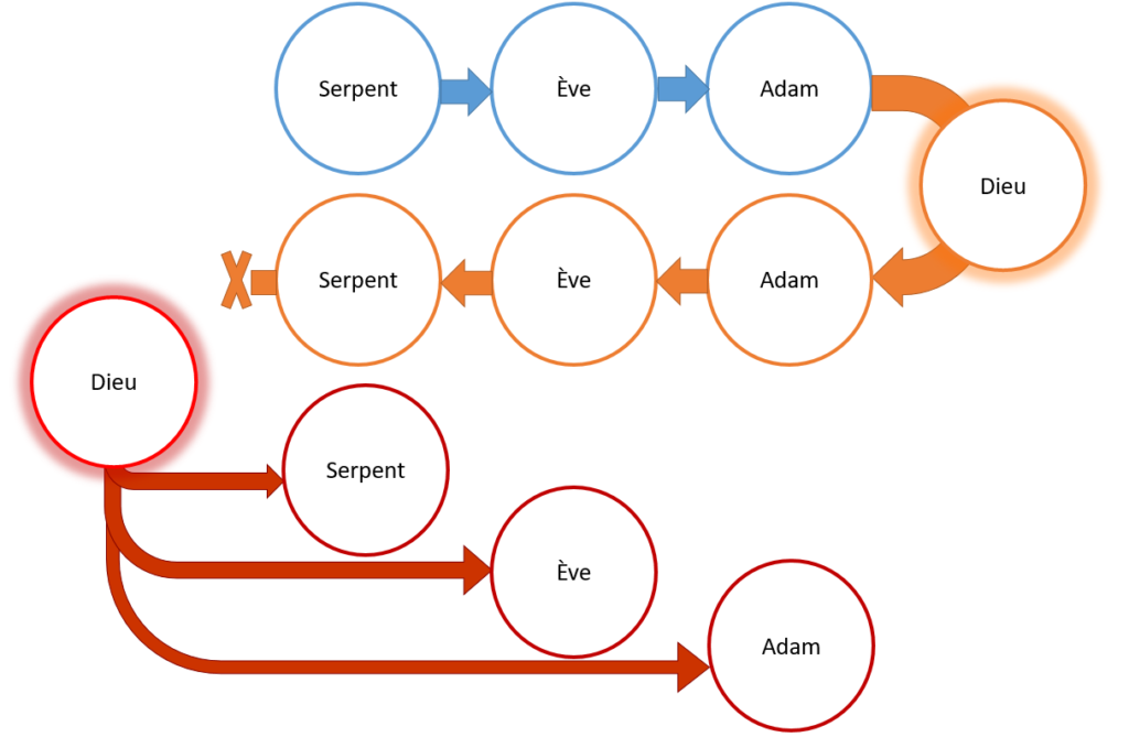 [En gros : Le serpent tente Ève qui tente Adam qui (avec sa femme) se cache de Dieu. Dieu interroge Adam qui accuse Ève qui accuse le Serpent à qui on ne donne pas la parole. Dieu Condamne le Serpent puis Ève, Adam]