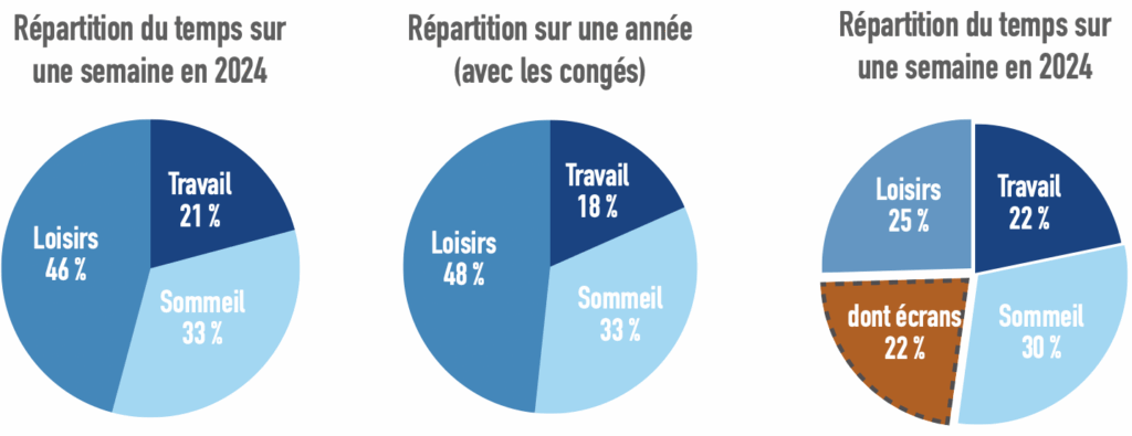 En 2 siècles, on a assisté à une inversion complète temps de travail-temps de loisir ! Sorti de son atelier, l’ouvrier ou l’artisan sous le règne de Louis-Philippe n’avait quasiment aucun temps libre. Aujourd’hui, grâce au repos dominical obligatoire (seulement depuis 1906 en France !), au congés payés et à la retraite, travailler représente une portion extrêmement minoritaire de notre vie. Nous avons tous en tête ces photos datant du Front Populaire avec ces travailleurs allant à la mer sur leur tandem. Ils étaient émerveillés d’avoir autant de temps pour eux ! Qu’en est-il aujourd’hui ?