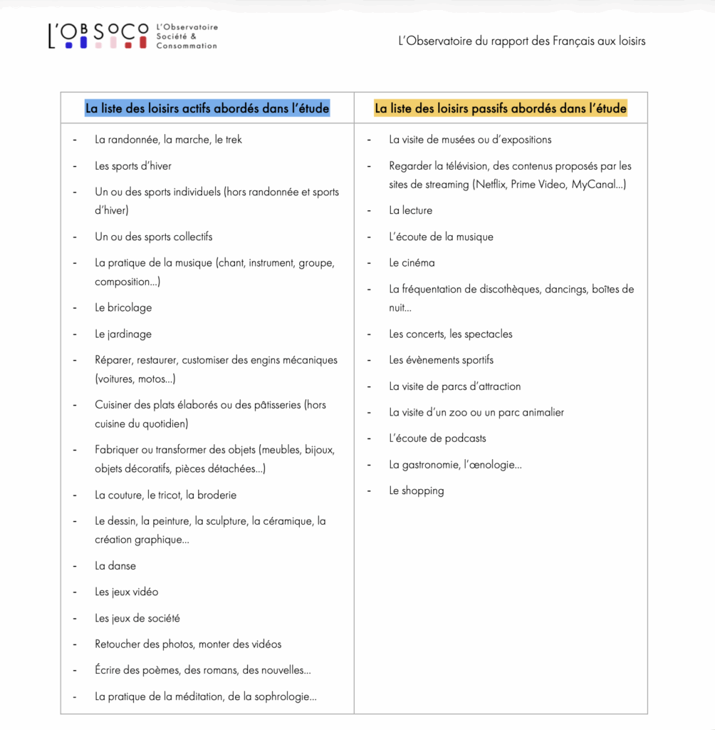 Nous allons maintenant nous appuyer sur une publication de l’Observatoire Société et Consommation (ObSoCo) à propos du rapport des français aux loisirs sortie en 2020.