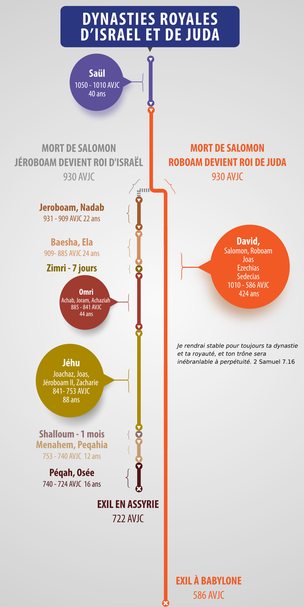 À partir de 1050, la terre promise est devenue une monarchie puis, à partir de 930, le grand royaume de Salomon a été démantelé en 2 : Juda au sud avec comme capitale Jérusalem et sur le trône un descendant de David et Israël au nord avec Samarie comme capitale et un général de Salomon sur le trône. Avec cette frise vous pourrez voir quelle dynastie (et donc quel royaume) a été la plus stable.
