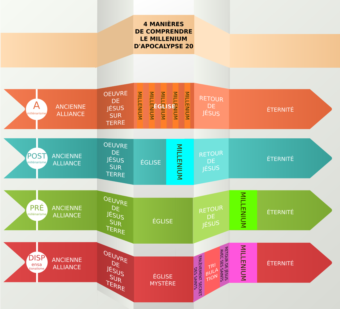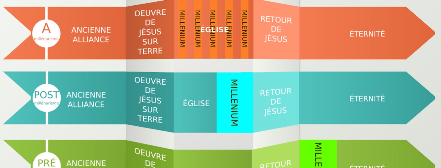 Le chapitre 20 de l’Apocalypse parle d’une période de 1000 ans pendant laquelle Jésus règnera pleinement avec les siens sur terre. Mais, parce que cette notion vient très tardivement dans la Bible, la manière de comprendre et de situer ce millenium diffère selon les théologiens. Voici donc une infographie qui décrit les quatre principales manières de voir.