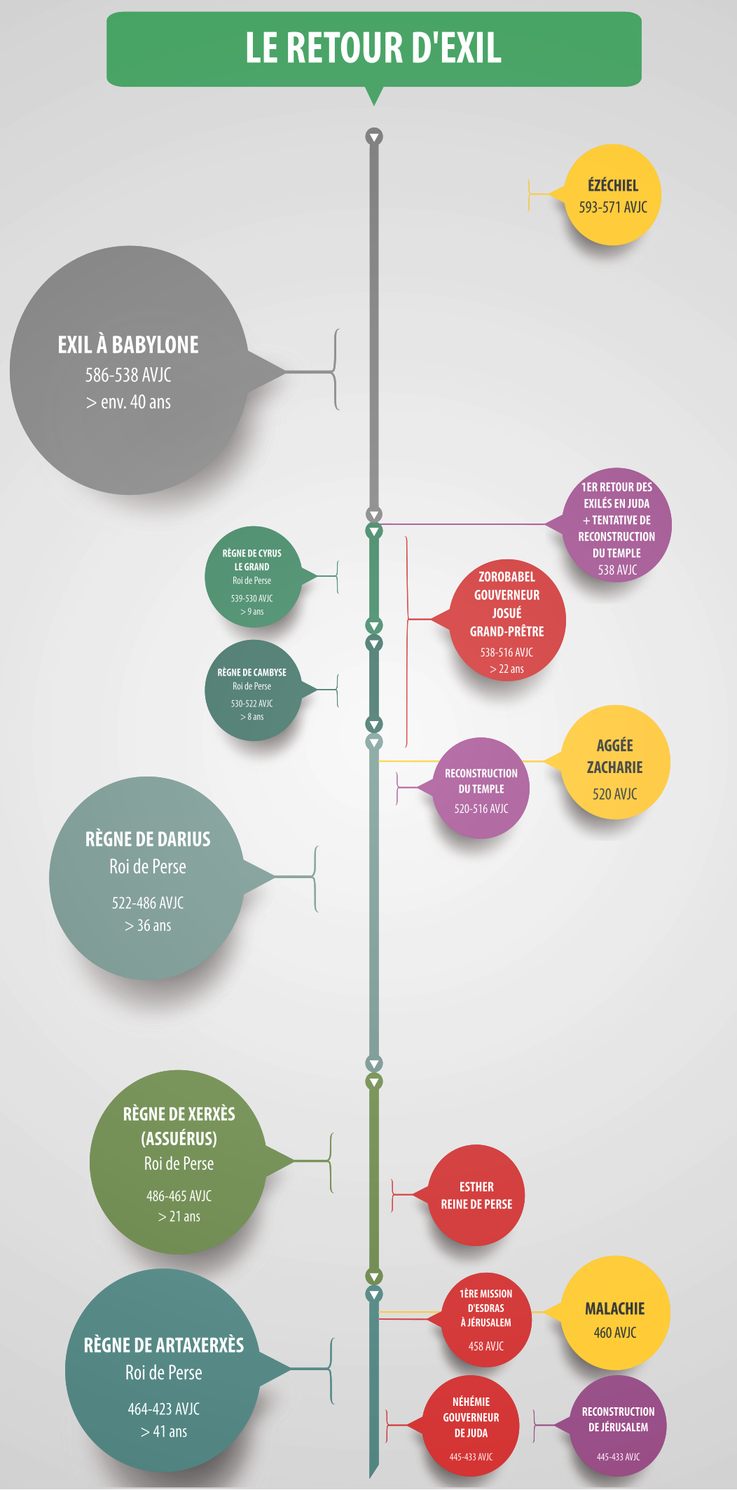 Après environ 4O ans passés à Babylone, certains judéens retournent sur leur terre ancestrale afin de reconstruire Jérusalem et son temple. Pourtant les choses seront compliquées et Dieu va envoyer des prophètes, des gouverneurs et prêtres pour encourager son peuple.