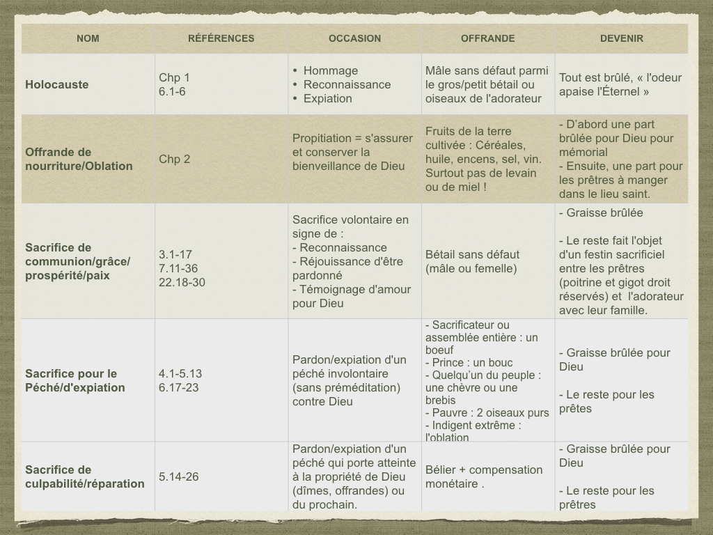 1. Les 3 premiers sacrifices décrivent l’effet du sacrifice sur Dieu (une bonne odeur agréable) alors que les 2 derniers décrivent l’effet sur le croyant (il lui sera pardonné).