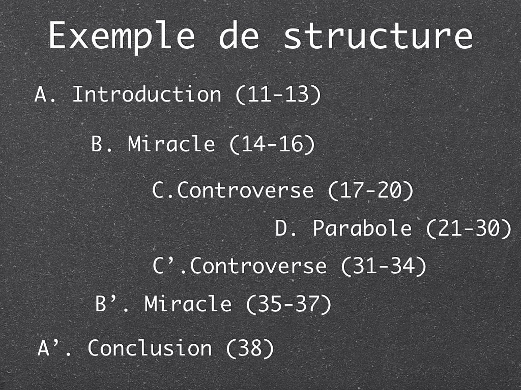 Vous l’avez remarqué : A’ répond à A, B’ répond à B et ainsi de suite. Le but de ce genre de construction ? Retenir le contenu d’un récit plus facilement, parfois (mais pas toujours) insister sur l’élément central, mettre en place un système de questions-réponses qui aide à comprendre l’enseignement général de l’auteur biblique ou, explication ultime, « parce que ça se faisait comme ça à l’époque et puis c’est tout ! ».