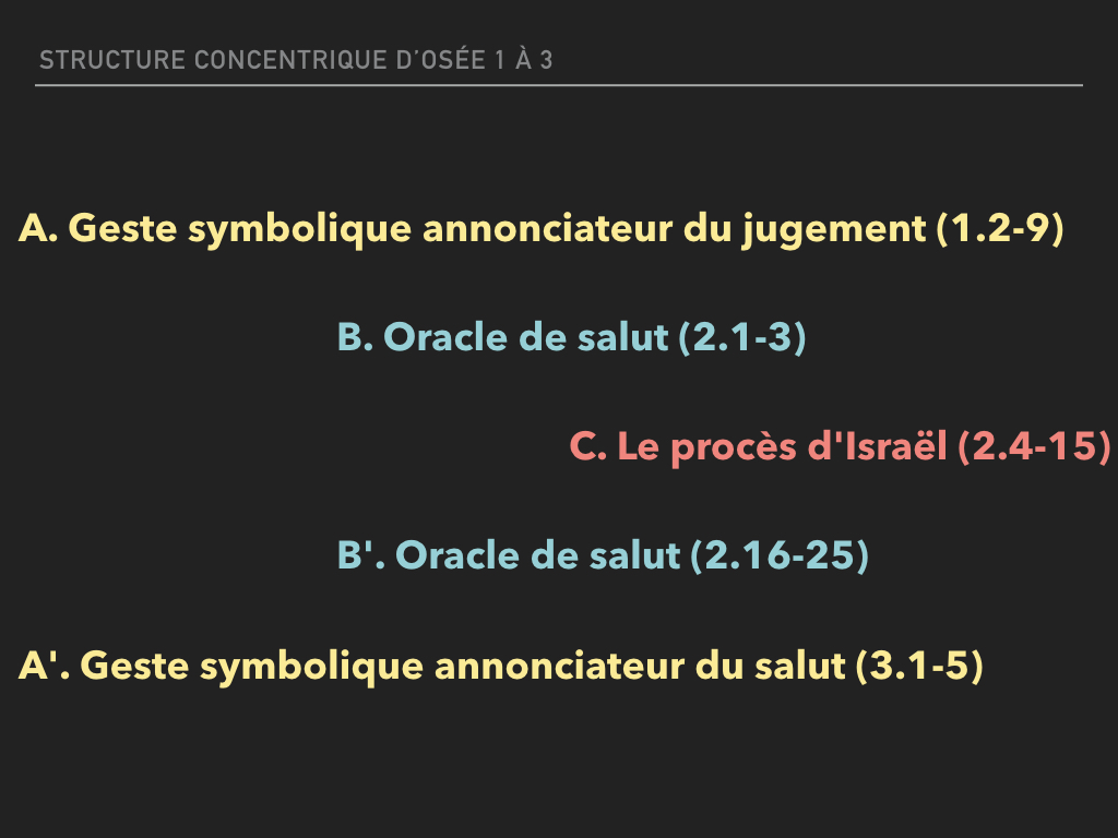 La structure concentrique est très pratique pour expliquer répétitions bizarres dans un récit et même des ruptures complètement inattendues. Voici l’exemple des 3 premiers chapitres du prophètes Osée qui contiennent (au moins) 2 éléments incongrus : 2 mariages avec une prostituée et la présence de 2 oracles de Salut en plein milieu d’une critique acerbe de l’attitude idolâtre d’Israël. Quelqu’un qui ne croit pas que la Bible est véridique dira « ces répétitions sont le résultat d’une compilation maladroite de plusieurs traditions/histoires différentes ! » mais un évangélique qui pense qu’il n’y a pas eu de fraude dans l’écriture de la Bible pourra s’appuyer sur son copain de le chiasme. Voici la structure qui peut être proposée pour éclaircir le mystère :