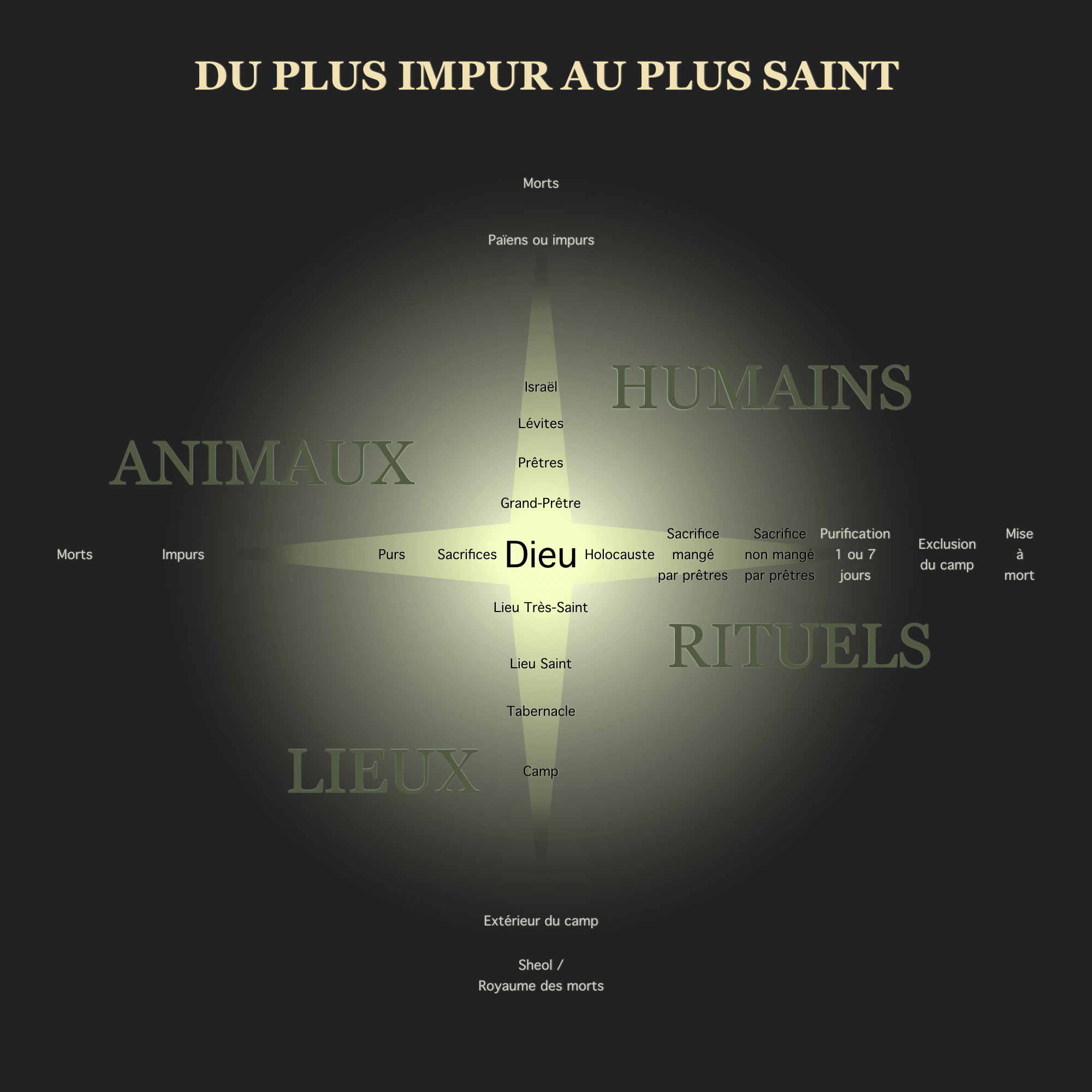 Plus saint, plus parfait que Dieu, ça n’existe pas. Cette réalité est un véritable problème quand on est humain, entaché par le Péché car cela veut dire qu’une relation avec le Créateur est impossible (enfin techniquement si, mais elle est extrêmement courte et finit très très mal). Heureusement, Dieu a fait en sorte qu’on puisse l’approcher en toute sécurité ! Seulement, ce n’est pas n’importe où, pas n’importe comment et pas par n’importe qui. Comme l’indique le passage ci-dessus, il faut tout d’abord être rituellement pur pour envisager d’entrer dans la « première zone » de la présence de Dieu (le tabernacle/temple). Mais pour aller plus loin, être pur ne suffit pas car le profane ne peut espérer une proximité trop grande avec Celui qui est trois fois saint. Il faut être particulièrement consacré pour accéder aux lieux où Dieu accepte de manifester sa gloire (lieu saint, lieu très saint). Le schéma ci-dessous donne un aperçu du pire et du meilleur selon Dieu dans quatre catégories. Par conséquent ce qui est le plus proche de Dieu est donc le plus saint et le plus éloigné le plus impur :