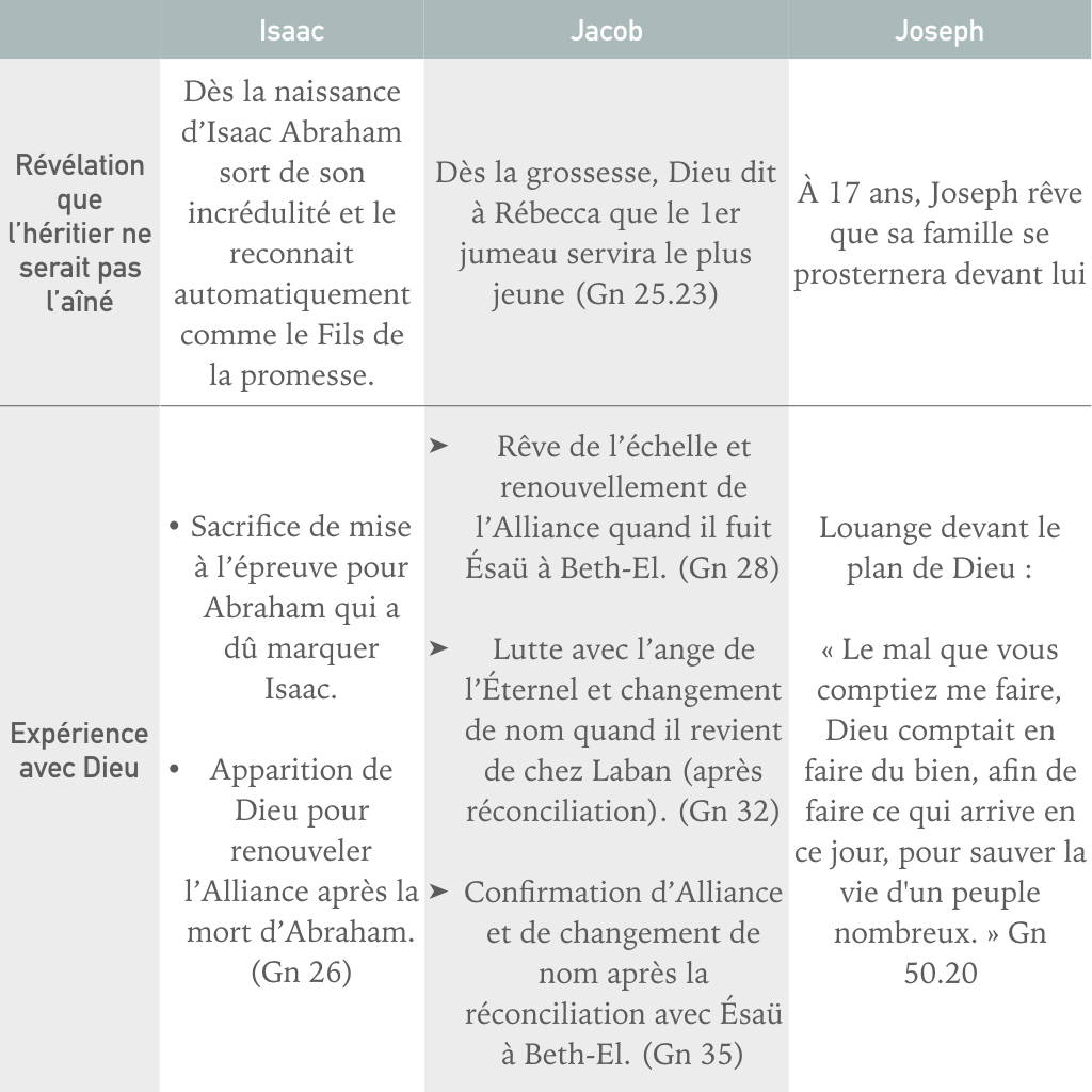 Tous ces « non-aînés » ne sont pas des usurpateurs car on sait très tôt dans chacun des récits que Dieu les a choisis. Il est intéressant de constater que celui qui a vécu les moments les plus intenses avec Dieu (Jacob pour ceux qui n’auraient pas compris) est celui qui avait le plus de problèmes moraux (hérités d’une famille très dysfonctionnelles). A contrario, celui qui est le plus droit (Joseph) n’a reçu aucune révélation spéciale de Dieu : est-ce parce que son père l’a (très bien) élevé après ses diverses rencontres déterminantes avec Dieu ?