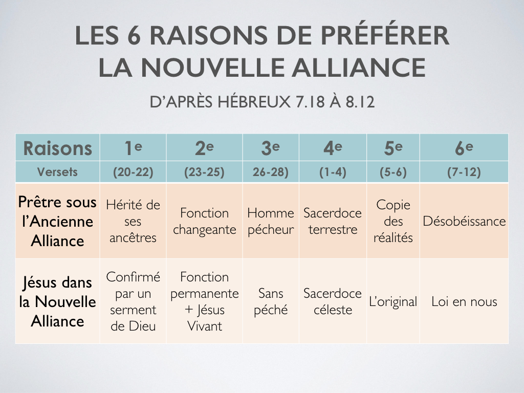 Pour contrer cette tentation de revenir en arrière, l’auteur de la lettre aux Hébreux va donc mettre en concurrence l’Ancienne et la Nouvelle Alliance afin de démontrer la supériorité de Jésus face au n°1 du judaïsme : le Grand-Prêtre. Pourtant dans ce match, Jésus n’a normalement aucune chance puisqu’il n’est pas issu de la tribu de Lévi mais de Juda. Sauf qu’il y avait à l’époque d’Abraham un personnage qui cumulait les charges de roi et de prêtre : Melchisédek. Après avoir établi que Jésus était de l’ordre de Melchisédek, l’auteur déroule d’autres preuves rassemblées dans ce tableau qui synthétise 23 versets :