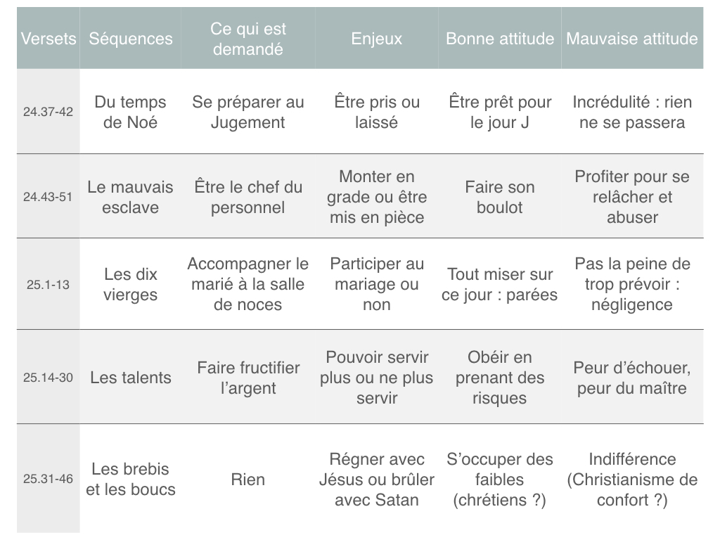 D’après ces enseignements, quelqu’un qui est réellement converti au Roi Jésus est un esclave qui se tient prêt, qui reste fidèle alors que le Maître tarde à venir. Comment est-il fidèle ? Simplement en obéissant, en accomplissant les tâches qui lui ont été assignées. Ce qui est dérangeant avec ces paraboles c’est que finalement… on est sauvé par les oeuvres ! Attention, c’est bien sûr par la foi en Jésus qu’on est sauvé mais s’il n’y a pas de fruits derrière la confession de foi, ça veut dire qu’il n’y a pas de foi du tout (Jacques rappellera cette vérité 15 ans plus tard). Quand on croit en Jésus, on se préoccupe premièrement de son Royaume, on fait tout pour que son règne vienne. La caractéristique des méchant(e)s des paraboles c’est que, malgré le fait qu’ils font partie du groupe des serviteurs, ils négligent des affaires de leur maître ! D’ailleurs au chapitre précédent, Jésus prononce un réquisitoire très sévère contre les chefs religieux. Leur crime ? L’hypocrisie car ils font mine de servir Dieu alors qu’ils se servent eux-mêmes.