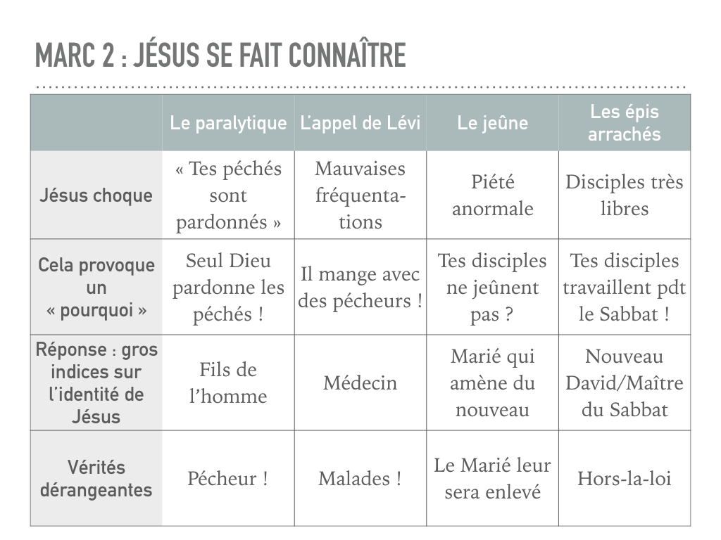 Dans Marc 2 il y a quatre épisodes qui se suivent : la guérison du paralytique, l’appel de Matthieu/Lévi, le non-jeûne de la troupe de Jésus et les épis mangés un jour de Sabbat. Ils ont 4 points communs. Voulez-vous relire le chapitre pour deviner ?