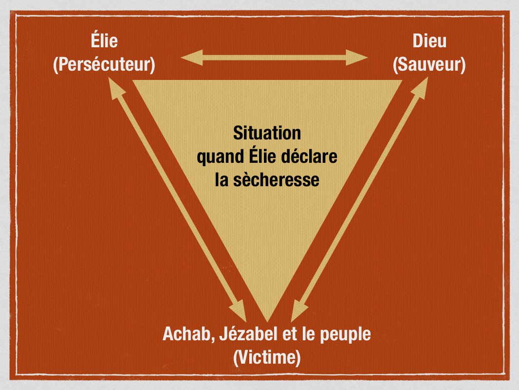 Élie est horrifié par la situation spirituelle de son peuple dirigé par un couple machiavélique. Il décide donc, sans que Dieu lui ait dit de le faire, que plus une goutte de pluie ne tomberait sur le pays. Il veut donner une bonne leçon à ses contemporains, il se situe donc clairement dans un rôle de persécuteur (je suis droit, tout est de ta faute). Cela force Dieu à jouer les sauveteurs pour le nourrir (via les corbeaux et la veuve de Sarepta) et le roi Achab à jouer la victime. Cela aboutit à cette conversation typique persécuteur-victime :