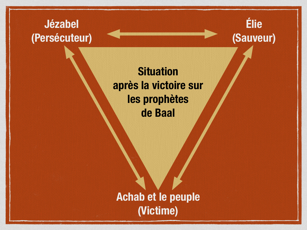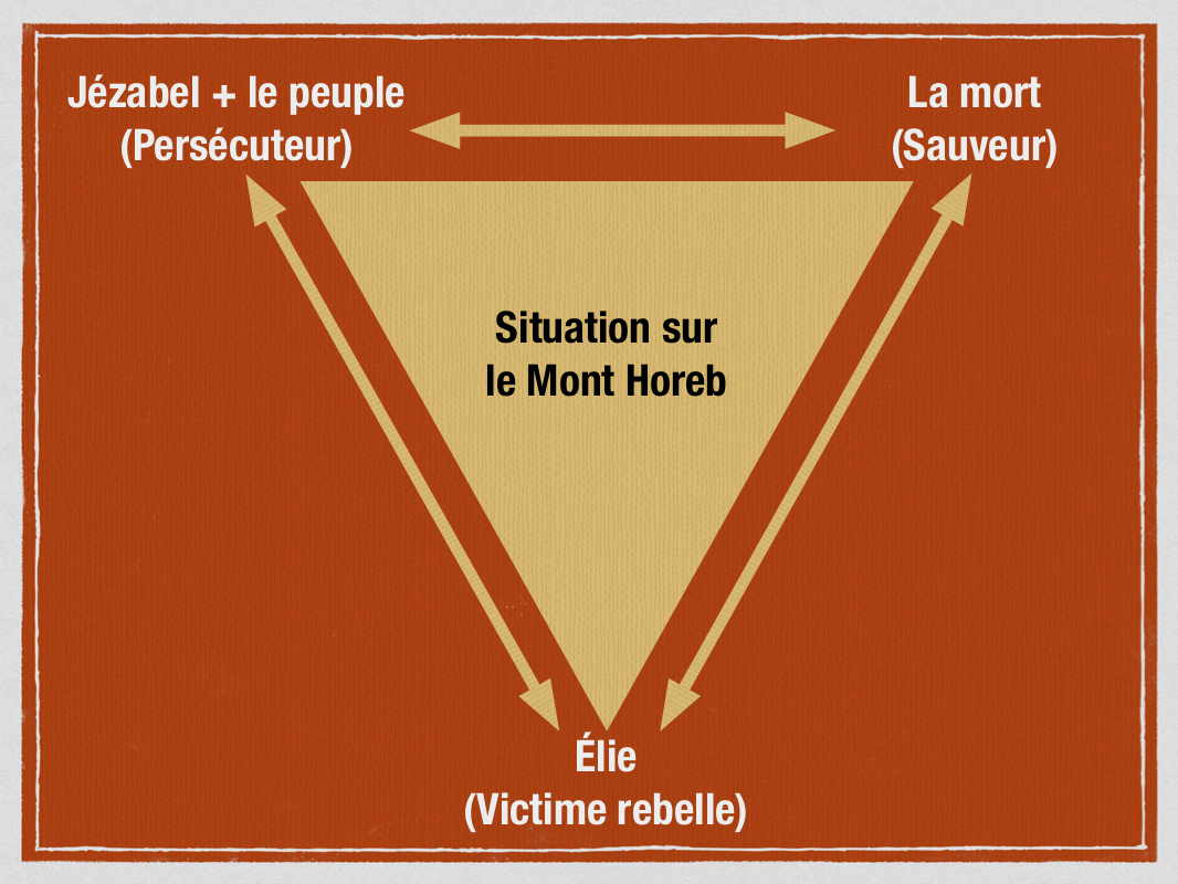 Souvent, Élie force tout le monde à obéir passivement à ses désirs. Mais peut-on sauver les gens malgré eux ? Le prophète croyait peut-être qu’après l’écrasante défaite de ses protégés, la reine Jézabel allait reconnaître l’évidence et plier le genou devant l’Éternel. Mais non, au contraire, elle met sa tête à prix, ce qui le met en fuite. Pourtant le lecteur se demande naturellement : pourquoi un homme de Dieu qui commande le feu du Ciel pour vaincre 850 magiciens fuit-il devant une seule femme ? La réponse est simple : c’est un sauveur déçu, blessé qui se sent trahi par ses victimes ! Il se transforme donc en victime, ses anciennes victimes (qui ne l’ont pas soutenu face la persécutrice) deviennent des persécuteurs et qui est le sauveur ? La mort. Élie est dégoûté, en plein burn out, il estime avoir été un mauvais sauveur donc il mérite ce châtiment… ou alors, après avoir endossé les 3 rôles il veut sortir du jeu. Dieu va effectivement sortir Élie du jeu mais pas en le faisant mourir. Il va plutôt reprendre la main sur les événements en l’amenant sur le Mont Horeb.