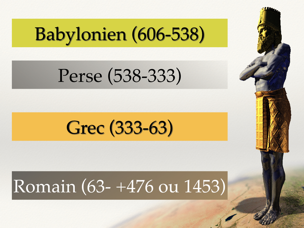 Heureusement, plus loin dans le livre (chapitre 7), nous avons la première vision de Daniel qui précise l’interprétation du rêve du roi babylonien :
