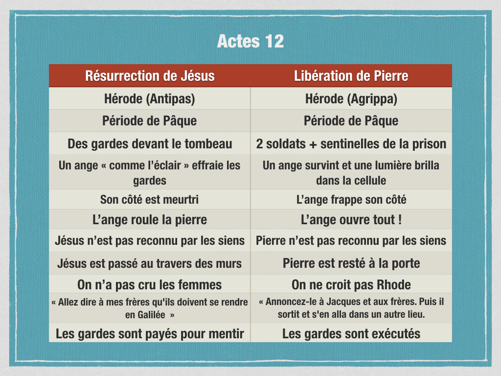 Même si le personnage principal de ce chapitre est Hérode (dont la puissance est écrasée par Dieu), la manière impressionnante dont Pierre sort de prison rappelle énormément la résurrection de Jésus. Comparons ces deux « sorties » miraculeuses :