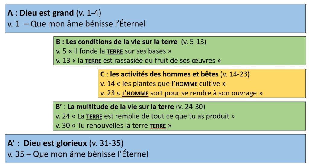 Ce poème qui nous transporte dans la création de Dieu et nous fait voyager en nous faisant emprunter à chaque strophe une nouvelle escale, et chacune de ces escales va dépeindre un tableau de la création. Le point de départ du voyage, c’est Dieu. Le psaume commence par : « que tout mon être bénisse l’Éternel ». Et on va nous présenter le Dieu majestueux qui est au-dessus de la création. Et puis de ce point de départ le Psaume va nous faire un mouvement de zoom, puisqu’après Dieu on va avoir une fenêtre sur le monde dans la deuxième strophe puis sur les habitants du monde dans la troisième strophe et à partir de là on va refaire un mouvement de dézoom, on va repartir dans le monde pour finir avec Dieu dans la dernière strophe, et le Psaume finit comme il a commencé en disant : « que tout mon être bénisse l’Éternel »