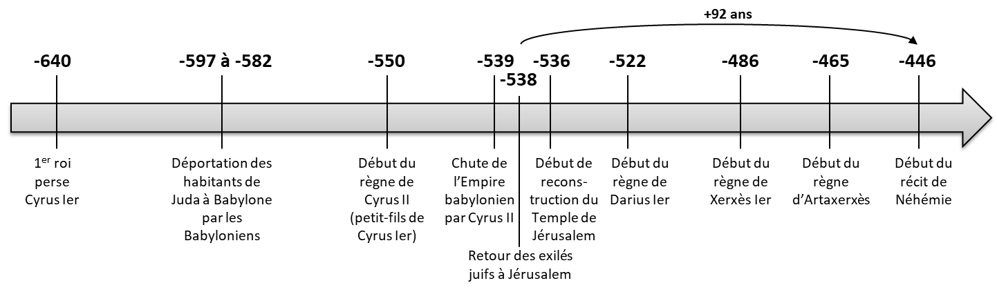 Le livre de Néhémie est l’une des rares autobiographies dans la Bible. Néhémie fait démarrer son histoire la 20ème année du règne d’Artaxerxès. Nous sommes donc 151 ans après la déportation des Juifs de Juda par l’empire babylonien, et 92 ans après le retour d’une partie des déportés à Jérusalem, encouragée par le roi Perse Cyrus II. Voici une petite chronologie pour mieux nous y retrouver :