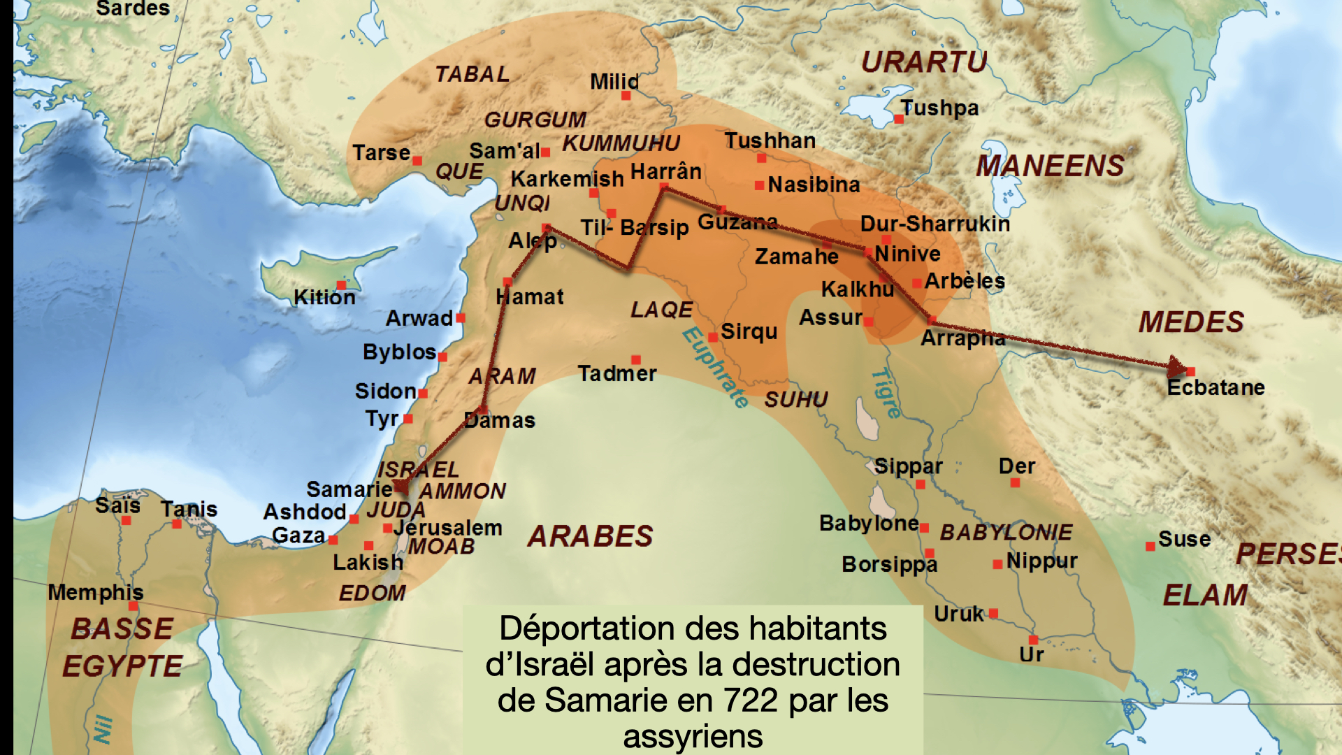 Conformément aux pratiques de l’époque, l’envahisseur prend l’élite politique et artisanale du vaincu pour la transplanter à l’autre bout de l’empire et met à sa place d’autres populations. Cela a l’avantage de décourager toute révolte puisqu’il y a désormais déconnection entre les peuples et leur terre d’origine.